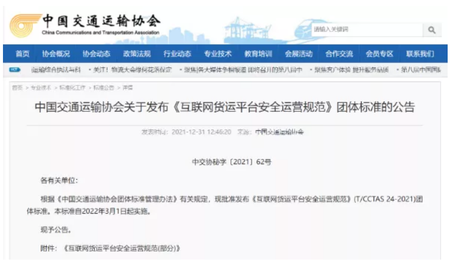 中国交通运输协会发布互联网货运安全运营标准