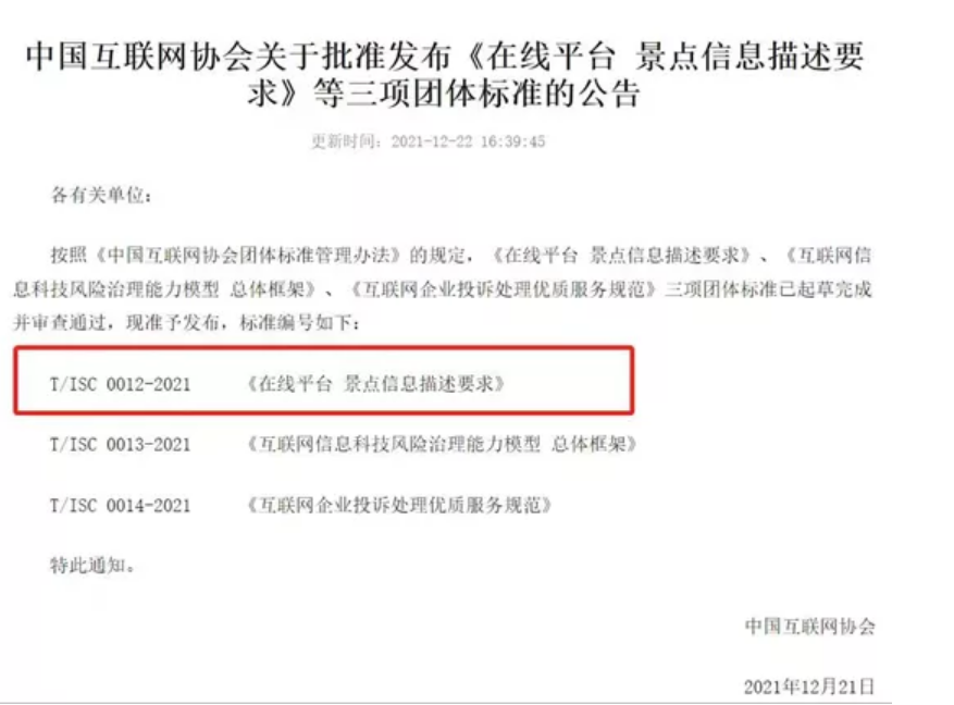 中国互联网协会发布《在线平台 景点信息描述要求》团体标准