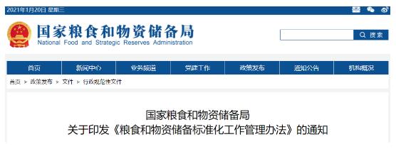 国家粮食和物资储备局印发《粮食和物资储备标准化工作管理办法》