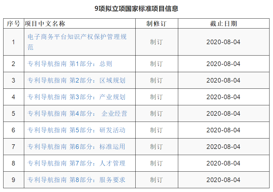 日前,国家标准委决定对《专利导航指南 第1部分:总则》等9项拟立项国家标准项目公开征求意见,征求意见截止时间为2020年8月4日。请登录全国标准信息公共服务平台的拟立项标准公示网页http://std.samr.gov.cn/gb/gbSuggestionPlan?bId=2181,查询项目信息和反馈意见建议。