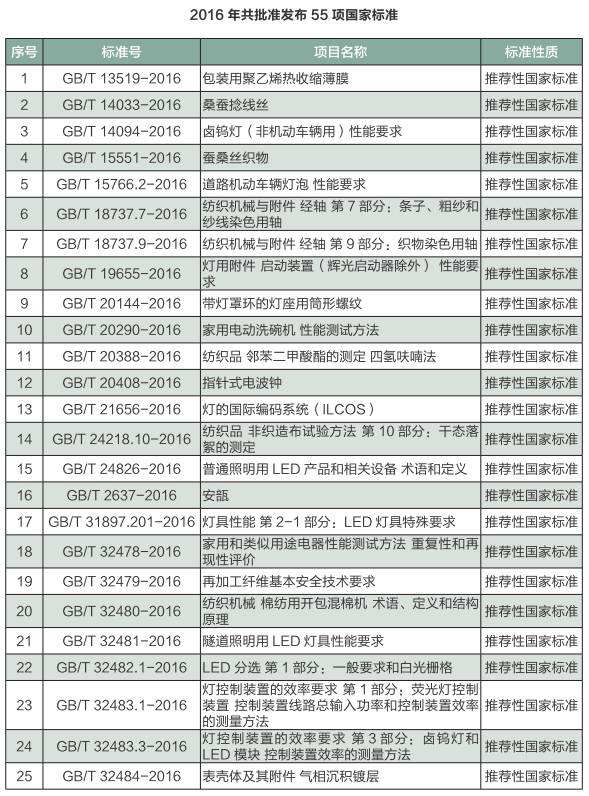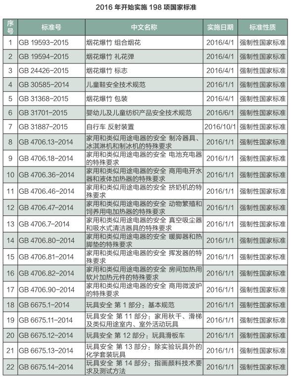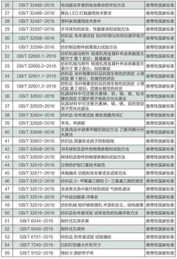 2016 年,消费品领域深入推进消费品安全标准“筑篱”专项行动,加强重点标准制修订,截至 11 月 1 日,共立项国家标准 50 项,批准发布 55 项,开始实施 198 项。国家标准委工业标准二部2016年11月◆ ◆ ◆ 来源丨国家标准委