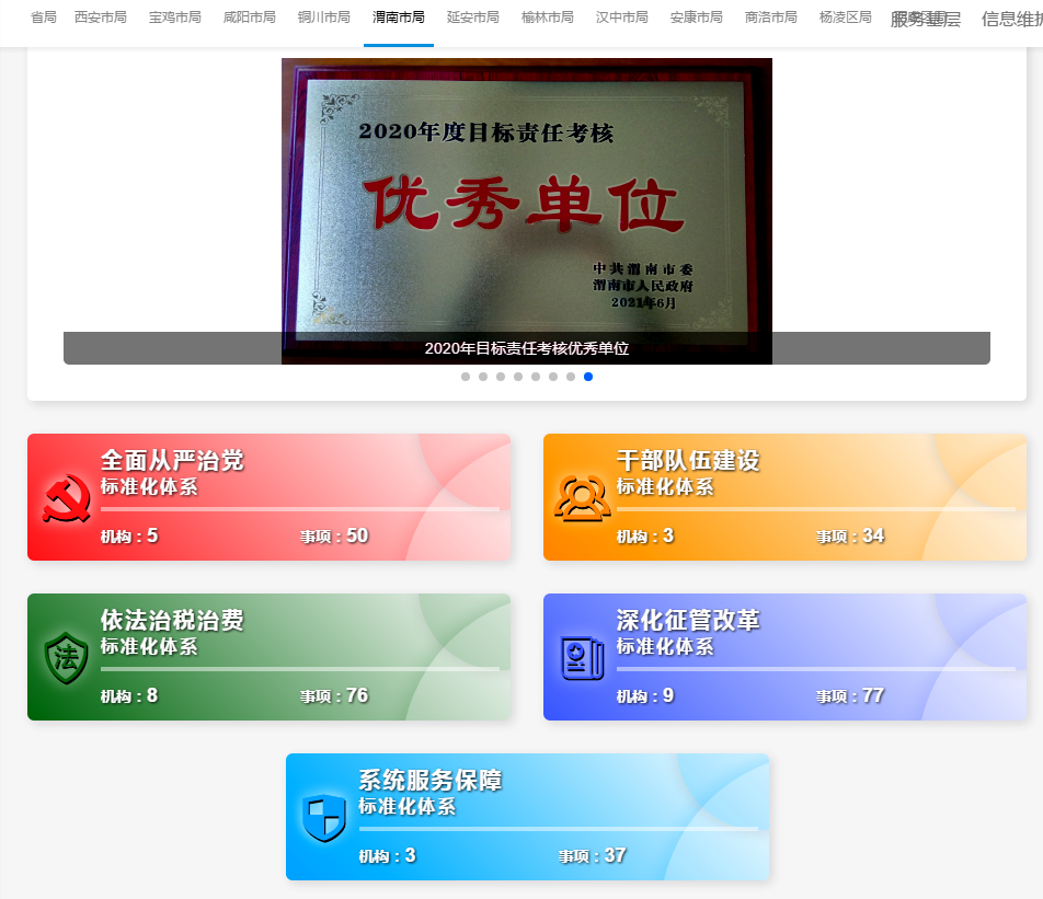 下一步,渭南市局将通过三项措施进一步推进标准化建设工作,着力做强“里子”,打响“牌子”。一是建机制,实现动态升级。建立“市县局自查+专班督查+条线指导”三位一体的优化更新机制,对已上传录入信息进行审核复查及全面梳理,把现有工作未规范到位的填平补齐、未厘清职责的细化完善,未形成闭环的修订出新,确保每项工作无漏项、无缺项。二是强宣传,打造动力引擎。加强特色亮点项目的宣传推介,在全系统开展“标准化建设优秀案例”评选,积极向省局推送优秀案例,打响渭南税务标准化建设品牌。同时将标准化建设成果在三楼会议室大屏进行展示,在向省局和市委、市政府汇报,或者向基层进行讲解的过程中,可以让标准化建设看的见、看的懂、感受的到。三是抓考核,提升工作质效。将绩效考核与标准化建设相结合,列出问题、任务、责任“三个清单”,科学设置“宣传、实施、巩固”三个阶段考核指标,将指标标准嵌入业务流程,融入岗责体系,以排名的方式实施动态管理,强化结果运用,奖优罚劣,以绩效考核推动标准化建设,以标准化建设的成效带动绩效考核的提档进位。