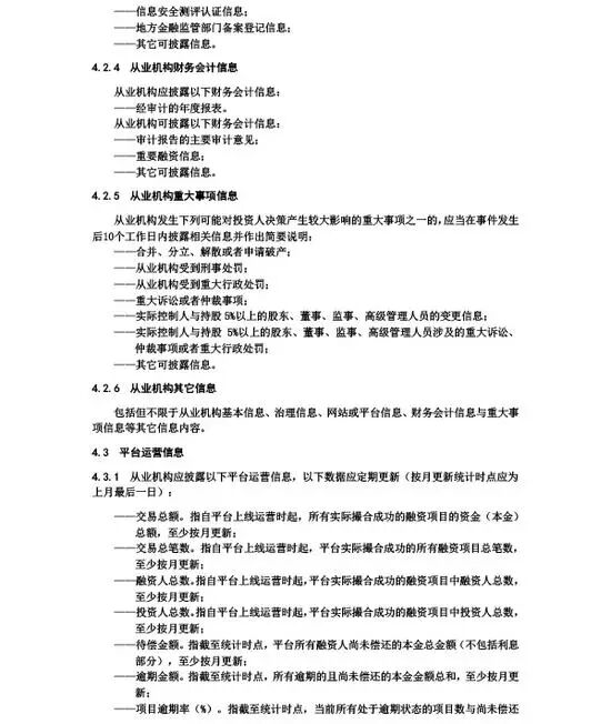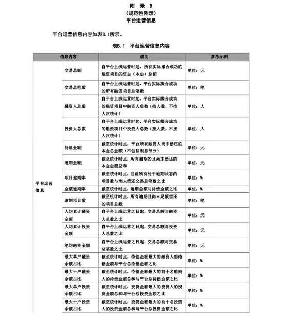 其中,《互联网金融信息披露个体网络借贷》标准(T/NIFA 1-2016)定义并规范了96项披露指标,包括强制性披露指标逾65个、鼓励性披露指标逾31项,分为从业机构信息、平台运营信息与项目信息等三方面。协会官方微信公众号表示,希望通过信息披露使行业达到“三个透明”,即通过披露从业机构、年度报表、股东高管与平台经营等信息,达到机构自身透明;通过披露资金存管、还款代偿等信息,达到客户资金流转透明;通过披露借款用途、合同条文、相关风险以及借款人信用等信息,达到业务风险透明。