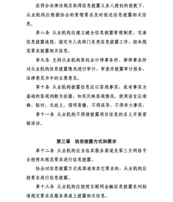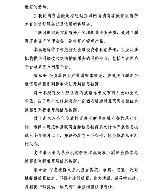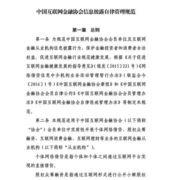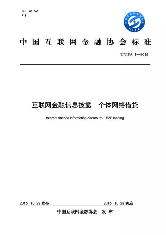 中国互联网金融协会于10月28日正式发布《互联网金融信息披露个体网络借贷》标准(T/NIFA 1-2016,下简称《标准》)和《中国互联网金融协会信息披露自律管理规范》(下简称《规范》),并于10月31日下发给会员单位。