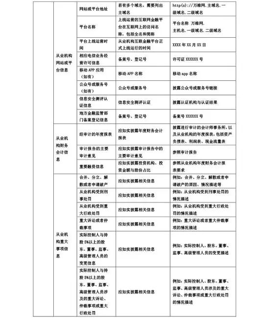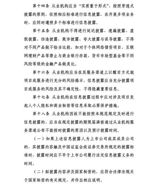 对于混业经营的互联网金融机构,《规范》第十四条显示,从业机构应当“实质重于形式”,按照穿透式披露的原则,依照相应标准进行信息披露,在开展多项业务时,应同时遵照多个标准进行信息披露。
