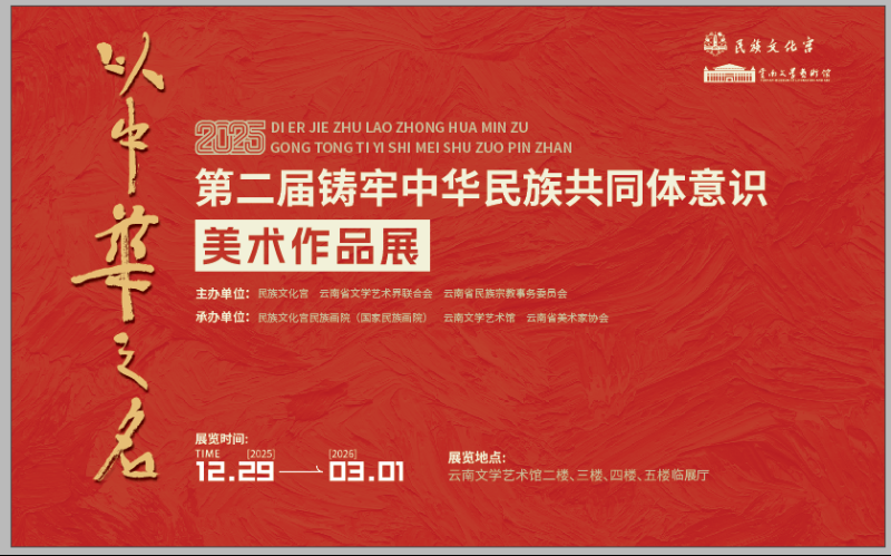 12月29日,由民族文化宫、云南省文学艺术界联合会、云南省民族宗教事务委员会主办的“以中华之名”第二届铸牢中华民族共同体意识美术作品展在云南文学艺术馆开展,展期将持续至2026年3月1日。